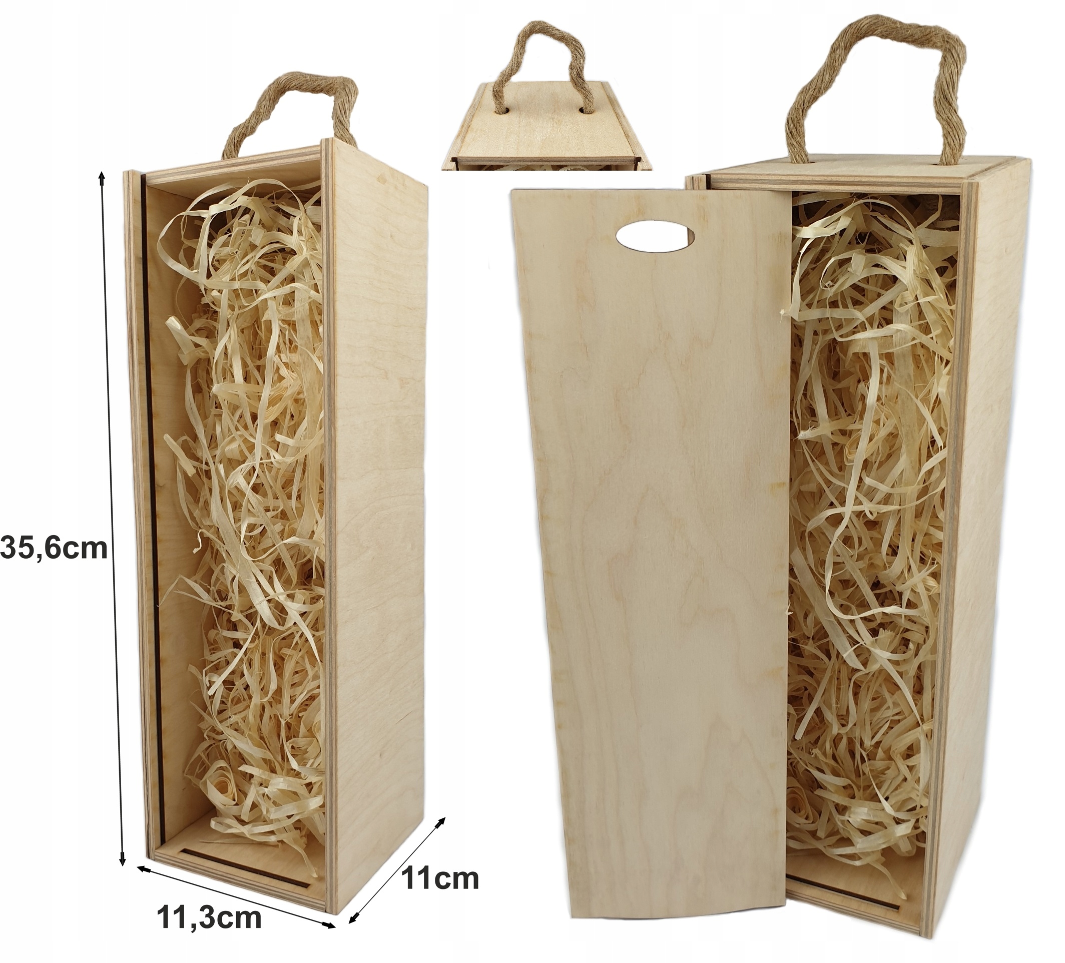 Budowa: drewniana skrzynka posiada solidny uchwyt oraz grube ścianki zapewniające stabilność zapakowanej butelki. Amortyzację butelki zapewnia wełna drzewna. Solidne. Trwałe. Mocne.