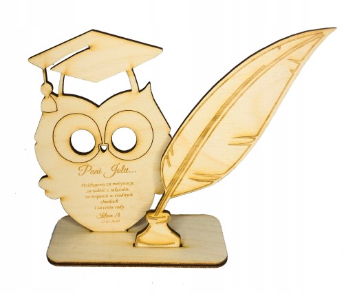 Drewniane podziękowanie na dzień nauczyciela sowa laurka stojąca