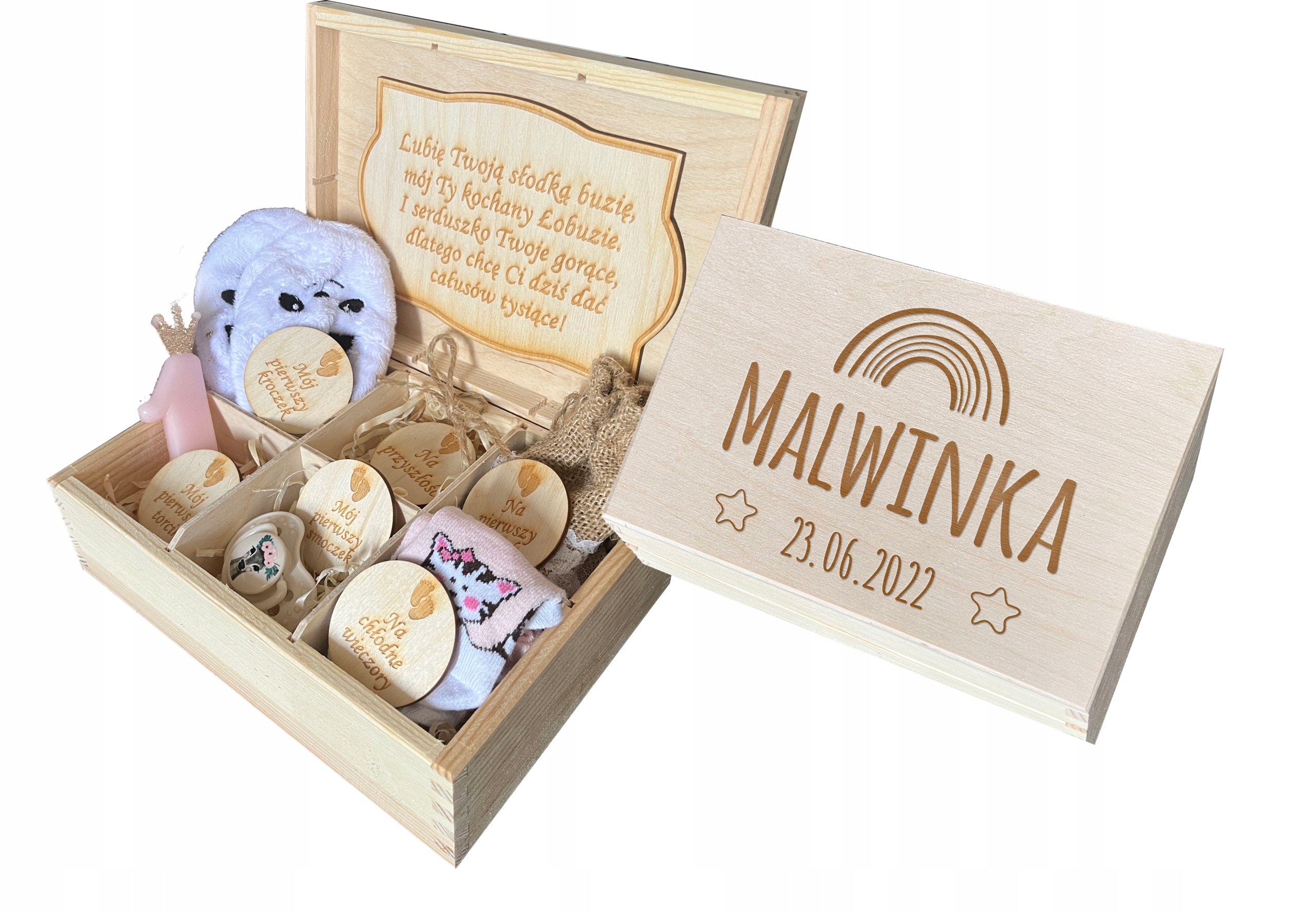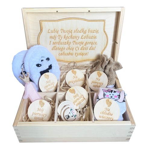 5. Pudełko nie zawiera dodatkowych przedmiotów widocznych na zdjęciach a nie wymienionych powyżej(art. spożywczych, woreczków jutowych, bucików, skarpetek, smoczków itd.)