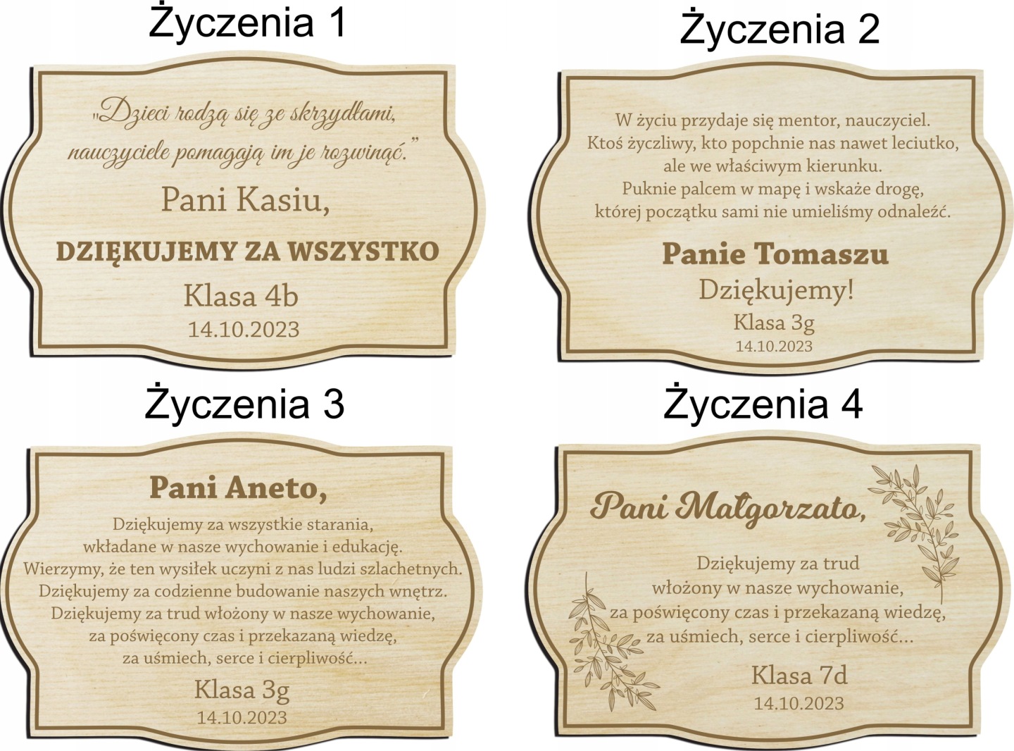 2.Wzór życzeń: NUMER WZORU I DANE DO ZMIANY(np. Wzór 1, Pani Kasiu, Klasa 4b, 14.10.2023)
