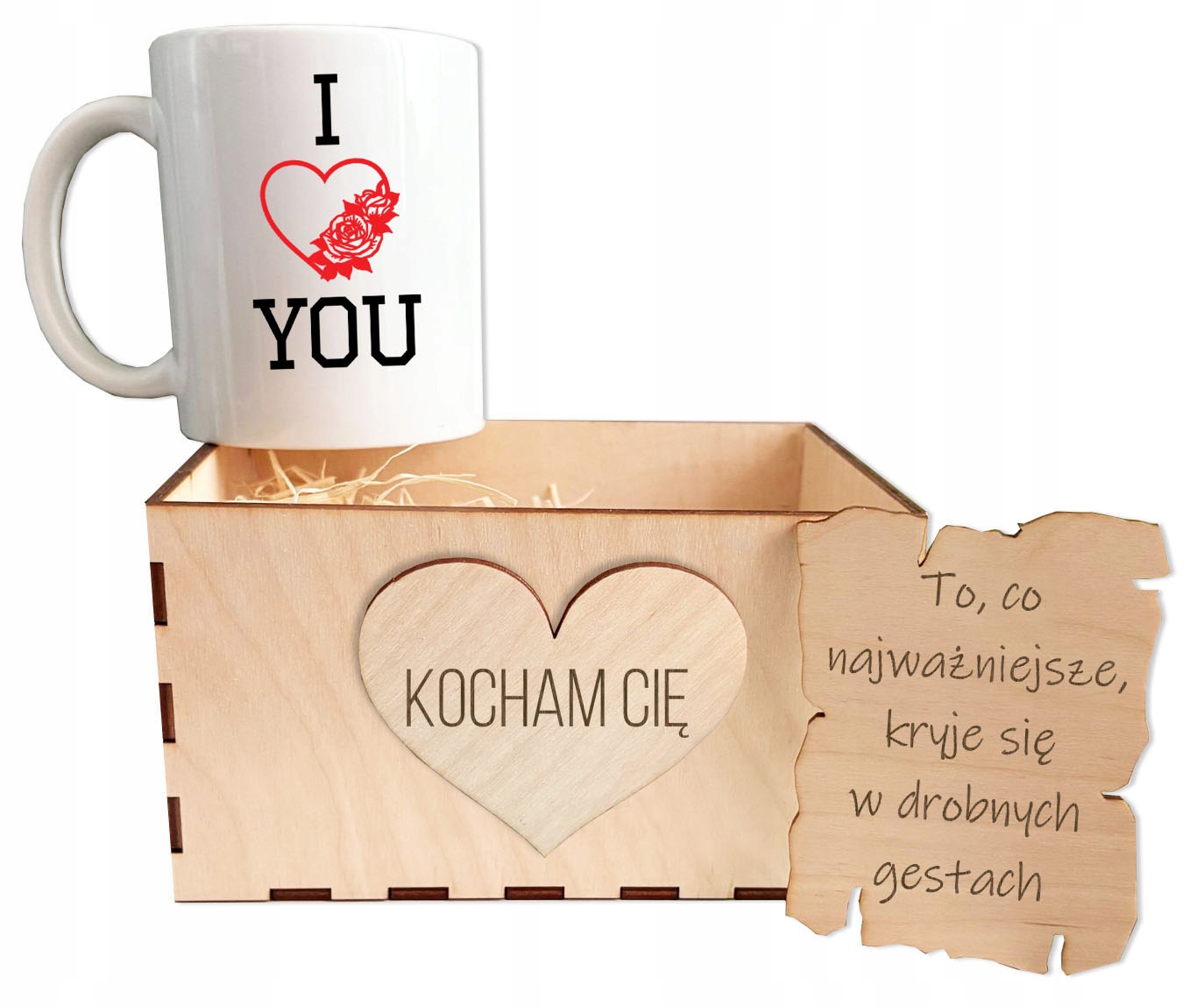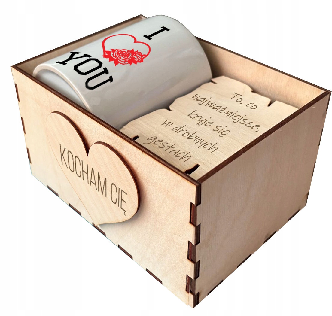 W zestawie znajduje się kubek umieszczony w eleganckim drewnianym pudełku, które pełni funkcję estetycznego opakowania prezentowego. Wewnątrz pudełka znajduje się drewniana tabliczka z dedykacją, nadająca całości osobistego i sentymentalnego charakteru. Dodatkowym elementem dekoracyjnym jest drewniane serce umieszczone na froncie pudełka, z wygrawerowanym napisem Kocham Cię, który jednoznacznie podkreśla romantyczny charakter prezentu.