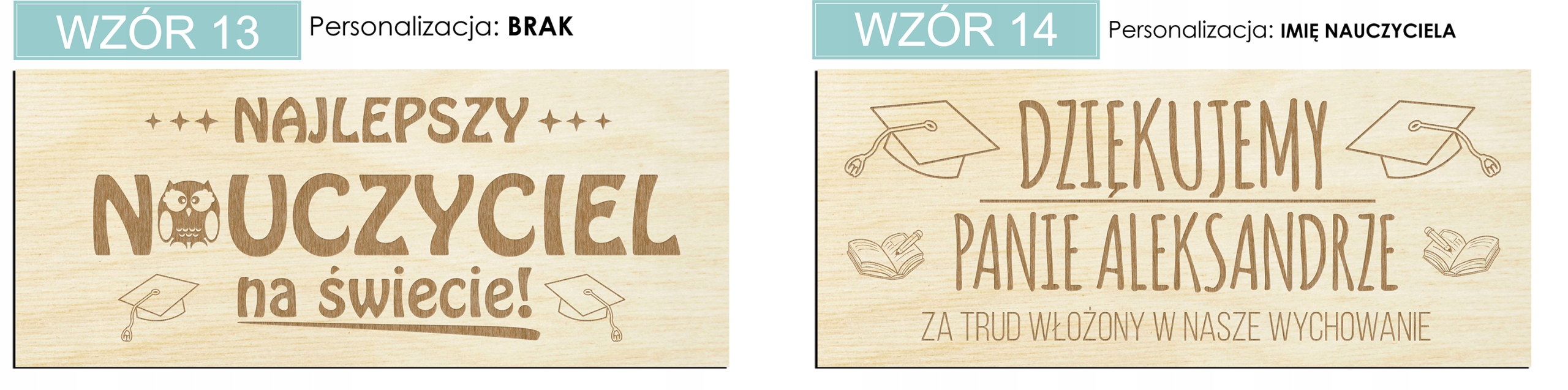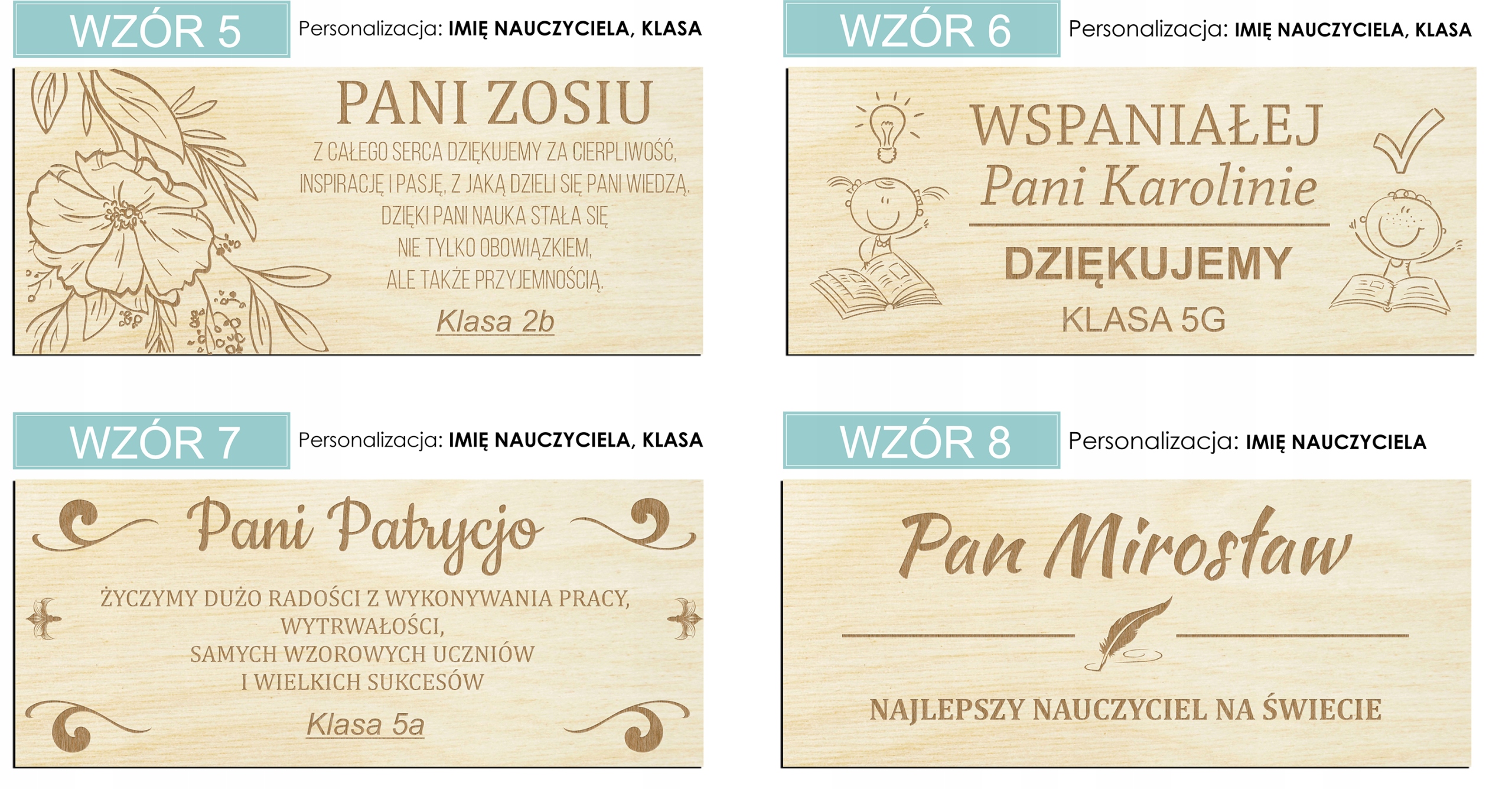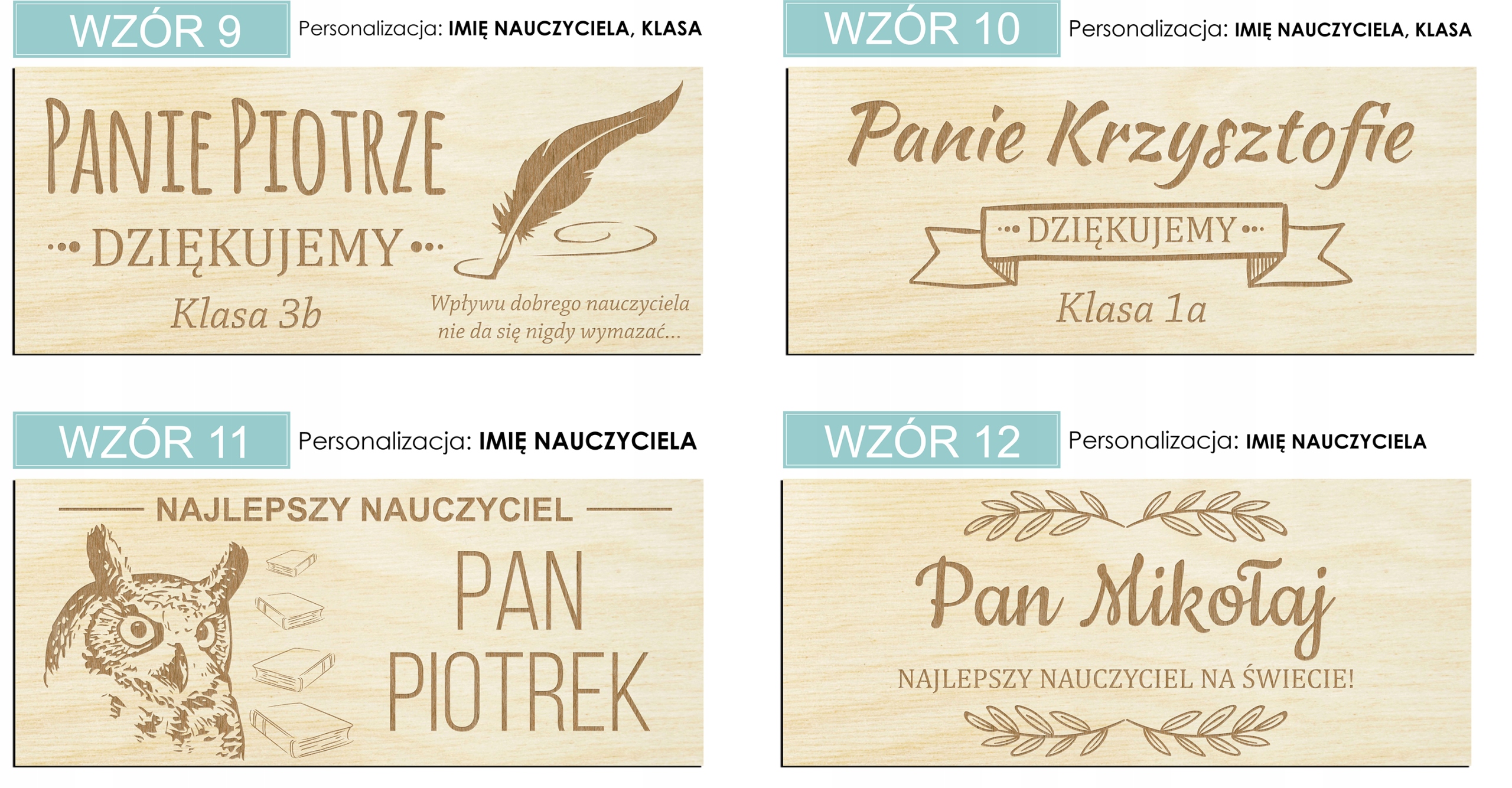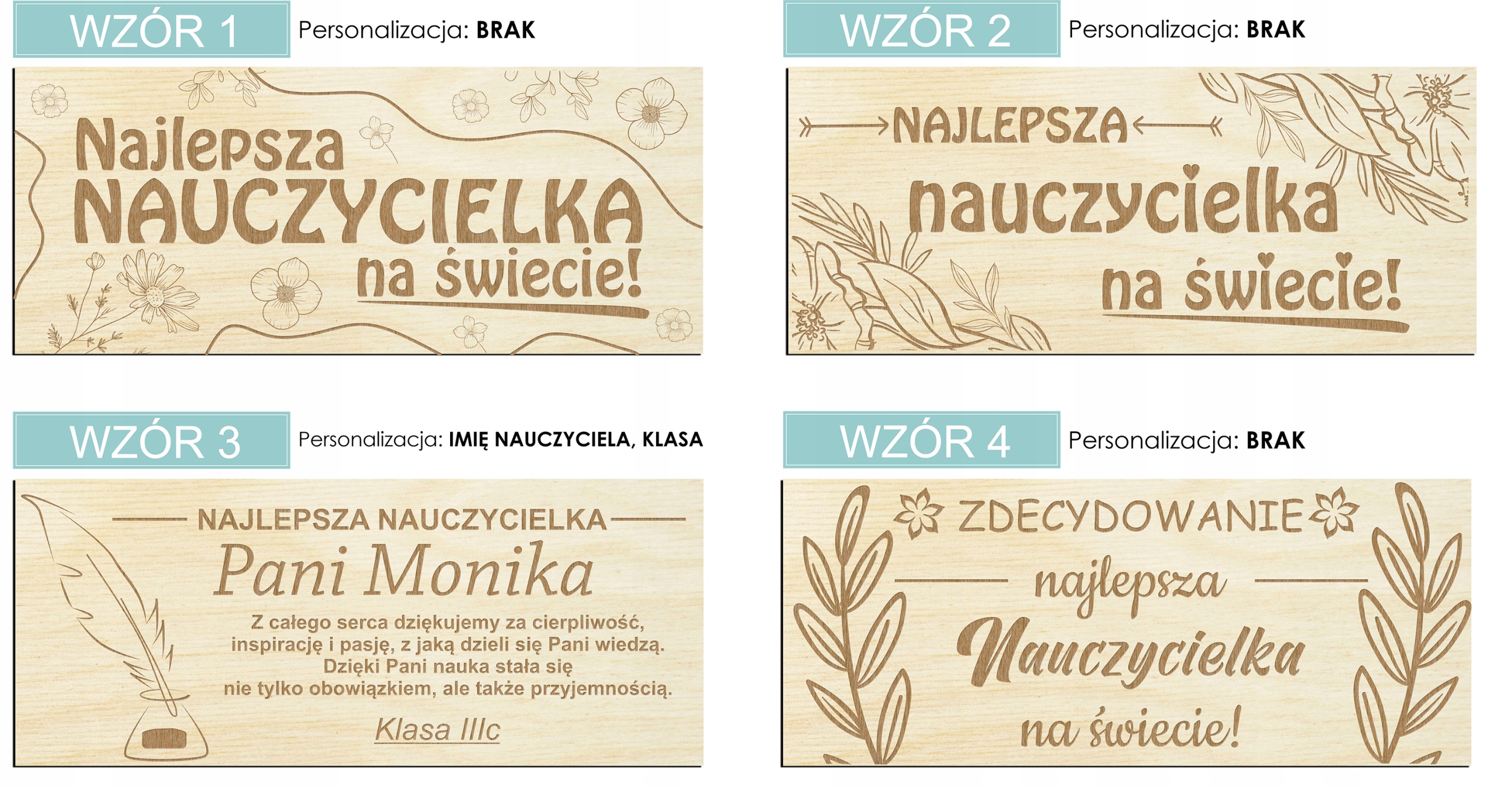 Każdy oferowany przez nas wzór nosidełka posiada dokładny opis z informacją, czy dany wzór można personalizować oraz jakie dane można zmienić (np. imię nauczyciela, podpis, dedykacja). Obok wzoru znajdziesz szczegółowe informacje dotyczące możliwości personalizacji – prosimy o ich dokładne sprawdzenie przed złożeniem zamówienia.