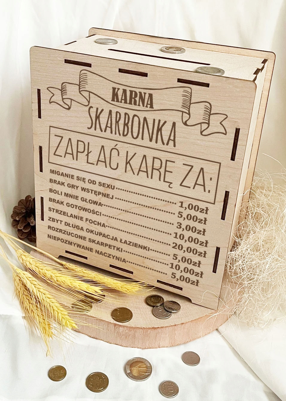 Skarbonka pomagająca Tobie i Twojej drugiej połówce utrzymywać dobre nawyki ;) Karna skarbonka to innowacyjne rozwiązanie dla tych, którzy chcą pracować nad swoimi przyzwyczajeniami, równocześnie ceniąc sobie dobry humor. Za każdy akt "Niewłaściwego zachowania" będziecie musieli zapłacić karę finansową.